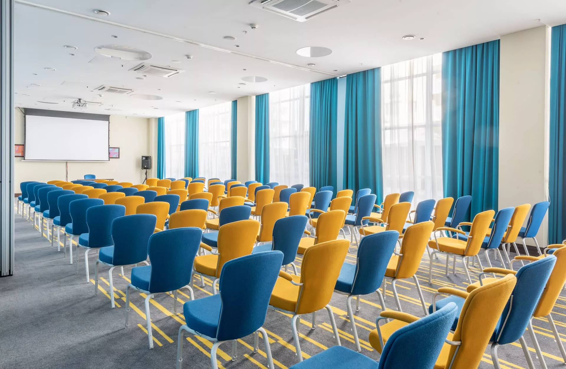 Зал имеет панорамное остекление. Зал оснащен стационарным проектором и экраном